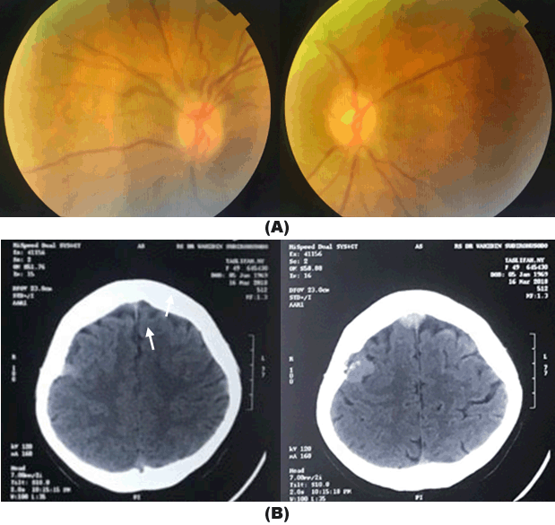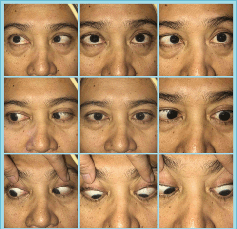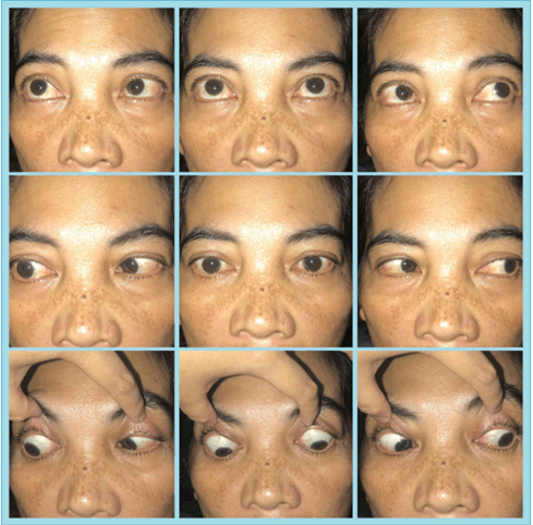 A 49-year-old woman with breast carcinoma was referred from oncology with double vision on left gaze in the last two weeks. She was diagnosed as having breast carcinoma since two years ago and was treated with chemo-radiation therapy and hormonal therapy. She complained headache, fever and severe vomiting. History of head trauma and decrease of visual acuity were denied. Ophthalmic examination showed best corrected visual acuity were 20/25 in both eyes, anterior segment was within normal limits. There was restriction in abduction on left eye corresponding to abducens nerve palsy (Figure 1). Posterior segments (funduscopy) of both eyes were normal (Figure 2A). We diagnosed her with left abducens nerve palsy. Non-contrast head Computed Tomography (CT) scan on axial slice showed hyperdense lesion with irregular firm edges, sized 2x1cm in the right frontal lobe and 2x2,4cm in the right parietal lobe. The lesion spreads and destructs the right frontal and parietal bones. CTScan result suggested intracranial and bone metastasis (Figure 2B).