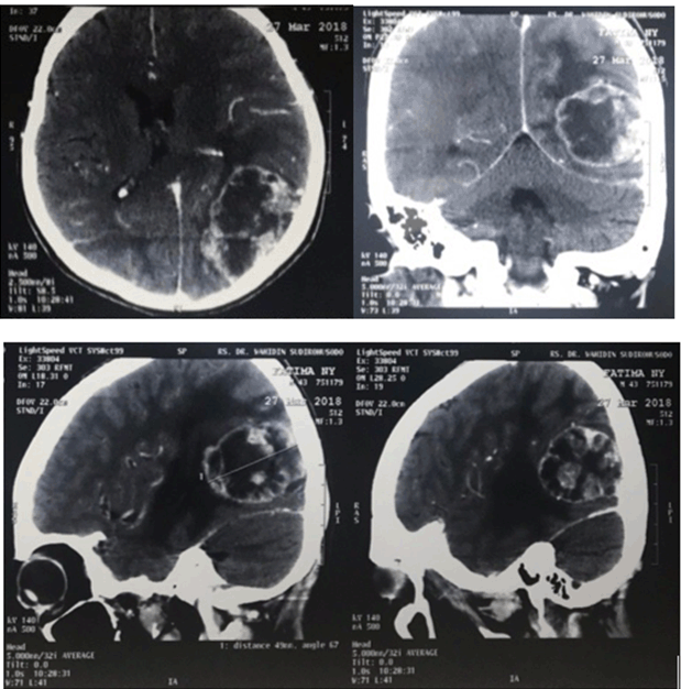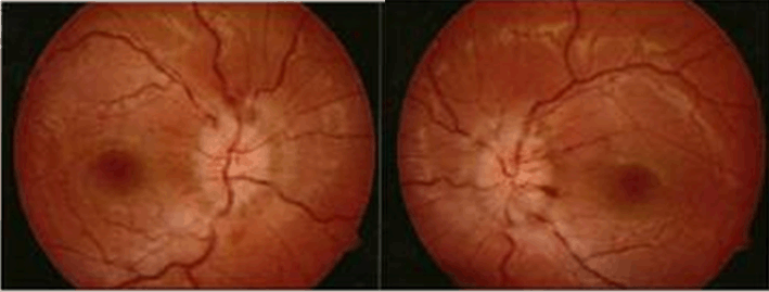 A 41-year-old woman with cervix carcinoma was referred from Gynaecology department with sudden decrease of vision and family noticed she had a squint from last three days. She complained a severe headache and vomiting. There was history of chemotherapy for two cycles and was discontinued about two years ago. Visual acuities were hand movement on both eyes, there was limitation of abduction on right eye (Figure 3). Anterior segments was normal. Funduscopy showed papilledema on both eyes (Figure 4). Head Multiple Slice Computed Tomography (MSCT) scan with contrast on axial slice showed heterogenous lesion and enhanced with contrast with irregular solid, firm edges, sized 4.2x5.8x4 cm, with focal edema around which pushed and narrowed the left lateral ventricle, which caused midline shift 0.5 cm to the right in parietooccipital lobe sinistra suggesting anaplastic astrocytoma (Figure 5).