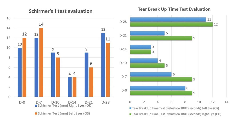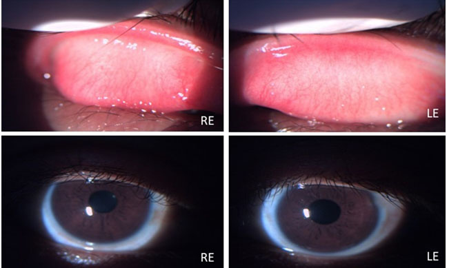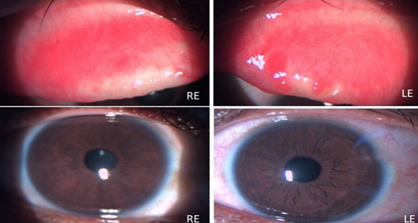 A 32-year-old woman complained of bilateral eye redness for one week with a teary eye, sensitivity to light, and watery discharge but without blurred vision. She did not feel like scratching her eye. She complained of a productive cough, stuffy nose, but without fever or pain in her eyes. She works at the bank using a computer, and she had a refractive lens exchange operation two years ago because of high myopia. There was no systemic condition such as immunocompromised or allergy. Her visual acuity was 6/6 on both eyes. Anterior segment examination revealed conjunctival hyperemia, edema, pseudomembrane, CVI, and PCVI on both eyes with filament on the left eye (Figure 1). She was given non-preservatives artificial tears eye drop and told to keep hygiene. She planned for several tests: ST 1, TBUT, Oxford Ocular Staining Score, and Ocular Surface Disease Index (OSDI) questionnaire. The following-up symptoms worsen on both eyes. She had membrane peeling with fluorometholone 0.1%, ofloxacin, non-preservative artificial tears eye drop. The Severe Acute Respiratory Syndrome Coronavirus 2 (SARS-CoV-2) rapid test came with positive IgG (Immunoglobulin G) result. After 14 days follow-up she had pseudomembrane with PCVI on both eyes (Figure 2). She had abnormal ST 1 and TBUT test evaluation on both eyes (Figure 3), with grade A-B Oxford Ocular Staining Score and high to low OSDI score up to 28 days follow-up (Figure 4). She achieved complete resolution after 28 days on both eyes (Figure 5).